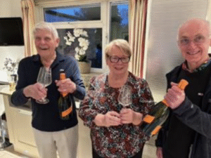 The award was made in a surprise visit to the couple’s home during a meeting of the social events sub-committee. And it came as a shock! As Cliff said: ”We were gob-smacked, and a few tears were shed, whenNigel and Mark gave us the award, along with two bottles of bubbly. So we opened a bottle immediately so that all could partake!”